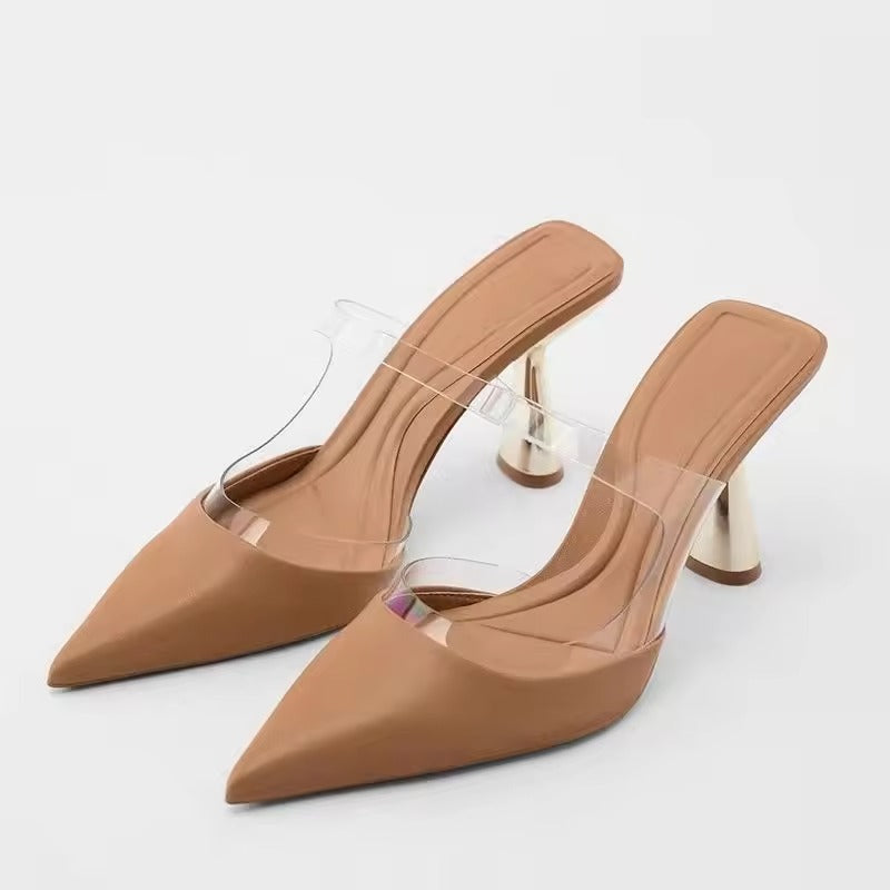 These chic pointed-toe mules feature a modern clear strap and sleek nude finish, complemented by a sculpted metallic heel. Effortlessly stylish for day or night looks.