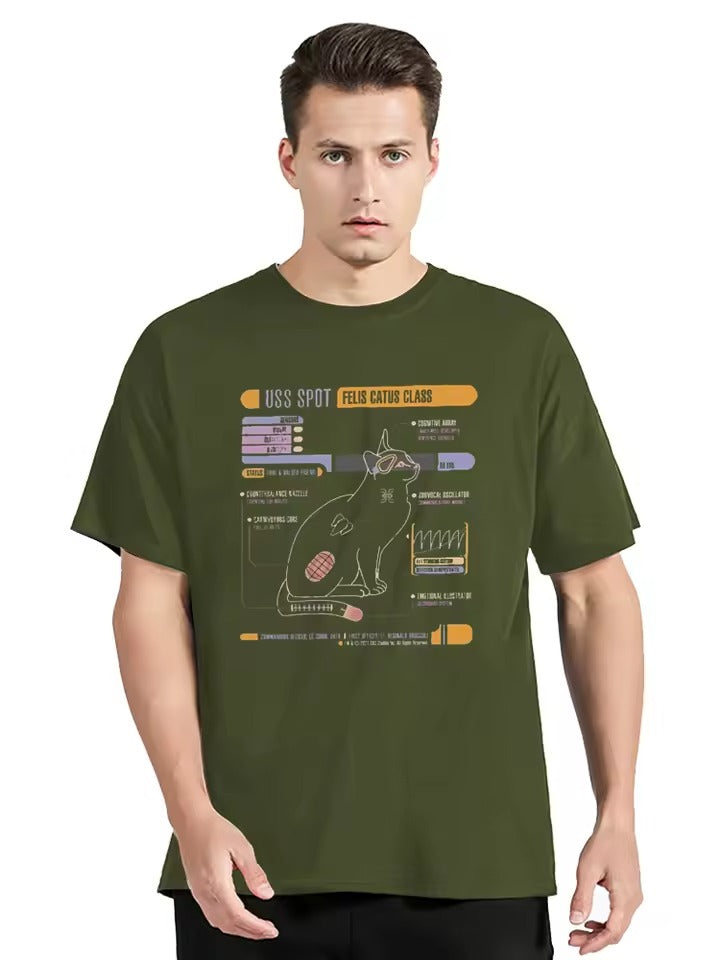 A playful olive green t-shirt featuring a colorful science-inspired cat graphic. Soft and casual, this tee adds a fun touch to everyday outfits.